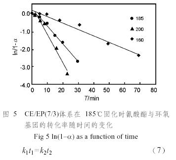 根据不同温度下的转化率(图4),计算各温度时的ln(1−α),并对时间t作图,可以得到一系列直线(图5),因此固化过程中氰酸酯基和环氧基的反应都属于一级反应。
