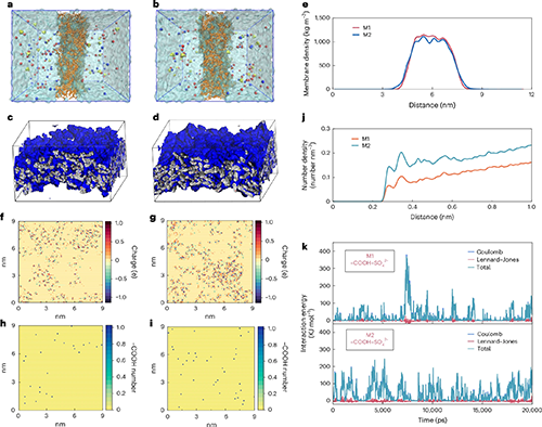 分子动力学模拟进一步揭示了电荷均匀性对离子选择性的影响机制:电荷不均的膜表面存在“低静电势区”,非目标离子易在此处突破屏障;而电荷均匀的膜能形成均匀的静电势垒,高效排斥多价离子,同时保证单价离子顺畅传输(图3a-k)。为进一步排除两款商业膜制备工艺差异的影响,团队采用相同支撑层与制备工艺,制备了两种负电聚酰胺膜(M-1与M-2)。结果再次验证:即使M-1膜的孔径分布更窄,但电荷均一性更高的M-2膜,其离子选择性仍比M-1膜提升30%以上,彻底证实了电荷均匀性对离子选择性的主导作用,颠覆了传统的“孔径决定论”(图2m-p)。