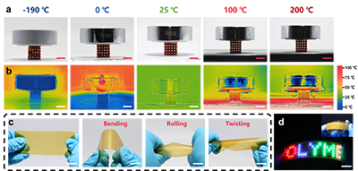 在极端高低温环境(-190~200℃)及1000倍自重载荷条件下,具备SL-IPN的三维结构试样在整个温域内均保持结构完整,无变形或断裂,且薄层结构也表现出优异抗脆性(图4)。该材料同时展现出与柔性器件良好的集成兼容性,为其在柔性电子与航空航天等极端环境下的应用提供了材料基础。