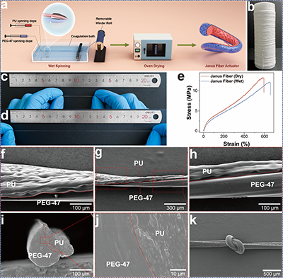 图1. Janus纤维驱动器的制备与表征。a)连续湿纺制备Janus纤维驱动器的示意图;b)Janus纤维批量收集的照片;c–d)Janus纤维拉伸前(c)与拉伸后(d)的照片;e)干燥与湿润状态下的应力–应变曲线;f–h)不同角度下的扫描电镜(SEM)图像,显示纤维的Janus界面结构;i, j)纤维横截面的SEM图像,清晰可见PU与PEG-47区域的界面;k)打结状态的Janus纤维体现其优异柔韧性。
