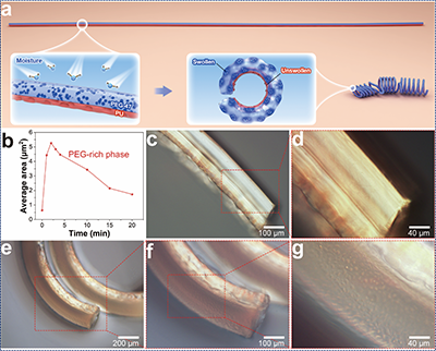 图2. 湿气驱动Janus纤维驱动器的作用机制与性能。a)湿气驱动的变形机制示意图;b)亲水岛相在湿气刺激后的面积变化随时间的演化;c–d)干燥状态下亲水性一侧光滑的显微镜图像;e–g)湿润状态下亲水性表面的岛相结构溶胀导致表面粗糙的显微镜图像。