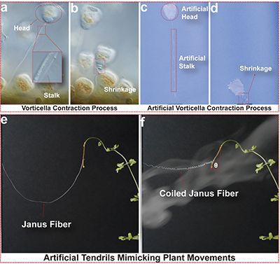 图4. 仿生运动示例。a, b)自然钟虫(Vorticella)收缩过程;c, d)本研究Janus纤维实现的人工钟虫收缩过程;e, f)Janus纤维模拟的人工卷须的湿气响应收缩行为。