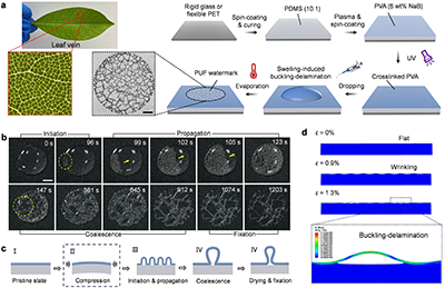 图1. PUF水印的设计与制备。(a)水溶胀诱导PVA/PDMS双层膜发生屈曲-分层,形成类叶脉状水印图案。(b, c)水印图案形成过程及机理。(d)屈曲-分层过程的有限元模拟结果。