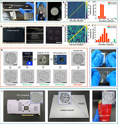 图5. 防伪水印的应用便携性与稳定性展示。(a-f)基于手机或扫描仪的水印特征采集与认证结果。(g)水印标签的环境稳定性测试。(h)水印标签的透明性和柔韧性展示。(i)水印标签在实际物品上的贴附应用示例。