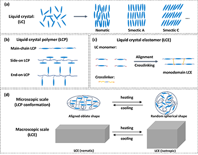 图1.示意图:(a) 液晶(LC)分子,(b) 液晶聚合物(LCP),(c) 液晶弹性体(LCE),以及 (d) 单畴向列相液晶弹性体(nematic LCE)的热致驱动:聚合物构象在液晶-各向同性(LC-I)相变过程中发生变化,这种构象变化可转化为LCE样品的宏观形变,并且这种形变在加热和冷却过程中是完全可逆的。