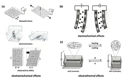 图2.电刺激响应液晶弹性体(eLCEs)的驱动机制:(a)机电效应,(b)电化学效应和(c)电热效应。