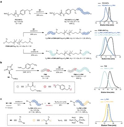 该质子转移聚合机制兼容多种酸性X–H/C–H键引发剂(通常pKa < 20),包括咪唑、酚、硫醇、羧酸等。多种生物分子,如氨基酸、糖肽以及未修饰的药物分子(如齐多夫定、索凡替尼)等,均可以高效引发聚合,得到结构明确的聚合物-生物偶联物。除此之外,作者还研究了乙烯基氮杂环丙烷和不同性质单体的嵌段共聚反应,成功制备了多种AB或ABA型嵌段共聚物,为聚多胺类高性能材料的制备提供了理论基础和技术指导(图3)。