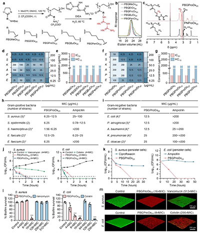宿主防御肽因其广谱抗菌活性和不易诱导抗菌耐药性的特点,已被广泛研究作为潜在的抗生素抗感染替代品。然而,宿主防御肽固有的局限性限制了其应用,如蛋白酶稳定性低、成本高和合成繁琐。因此,宿主防御肽模拟物已被广泛研究,旨在解决耐药细菌感染问题。然而,受到抗菌和穿透血脑屏障性能的限制,目前关于治疗细菌性脑膜炎的报道很少。宿主防御肽及其模拟物的侧链通常具有胺基或胍基阳离子基团,通过正电荷基团与带负电荷的细菌膜磷脂的初始相互作用,从而进一步发挥破膜抗菌活性(图1a)。然而,利用这两种基团一般难以实现高效抗ESKAPE活性和血脑屏障穿透能力的双功能活性。