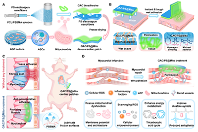 图1. (A) GAC/PS@Mito心脏贴片制备过程;(B) Janus心肌贴片与湿润组织的粘附机制:干燥生物粘合剂吸收界面液体。随后,通过渗透效应及共价/非共价交联实现强界面粘附;(C) Janus心肌贴片预防术后组织粘连并促进心肌梗死修复;(D) Janus心肌贴片促进心肌梗死修复的机制:该心肌贴片提高心肌细胞中线粒体的功能,从而降低炎症反应和活性氧水平,促进血管生成并改善心脏功能。