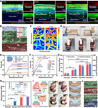 图3. (A) Janus心肌贴片的组织渗透效果;(B) 组织渗透效果的SEM照片;(C) Janus心肌贴片渗透至心肌组织的有限元分析模拟;(D) 代表性照片展示PS静电纺丝与GAC生物粘合剂面在湿润猪组织上的粘附特性;(E) Janus心肌贴片180°剥离试验的力-位移曲线;(F) Janus心肌贴片搭接剪切试验的力-位移曲线;(G) Janus心肌贴片在湿润猪皮上的拉伸强度与界面韧性;(H) Janus心肌贴片在湿润猪心脏组织上的爆破压力;(I) Janus心肌贴片的器官密封效果;(J) 粘合界面处的SEM照片。