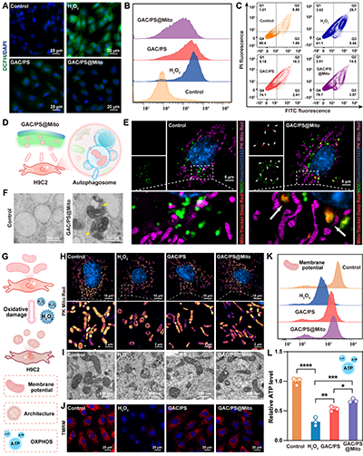 图4. (A) H9C2细胞内ROS水平的代表性荧光图像;(B) 各组H9C2的DCF荧光强度;(C) H9C2细胞凋亡的流式细胞术结果;(D) GAC/PS@Mito心肌贴片递送线粒体并诱导自噬;(E) 荧光图显示H9C2细胞内线粒体的摄取和分布;(F) TEM图像显示自噬体与线粒体的共定位;(G) H9C2细胞氧化损伤的示意图;(H) H9C2细胞内线粒体形态和网络结构;(I) H9C2细胞中线粒体形态的TEM图片;(J) H9C2细胞中线粒体膜电位强度;(K) 线粒体膜电位强度的流式细胞术结果;(L) 不同组别H9C2细胞内ATP水平。