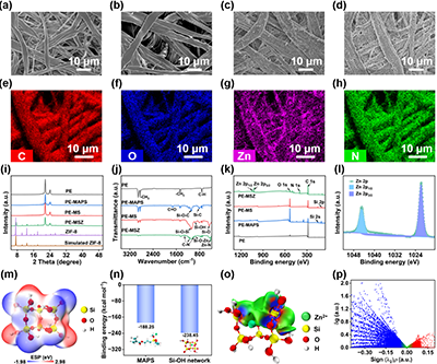 SEM、XRD、FTIR、XPS结果分析都表明了SiO2与ZIF-8涂层在PE纤维表面的均匀原位沉积。进一步通过密度泛函理论计算得到Si-OH网络与Zn2+之间具有更高的结合能。基于分子密度Hirshfeld划分的独立梯度模型(IGMH)对优化后的Si-OH网络与Zn2+之间的相互作用进行可视化分析表明,它们之间存在强吸引作用(配位作用、离子-偶极作用)和范德华力作用。综上所述,PE-MS通过Si-OH与Zn2+之间存在的共价键作用(Si-O-Zn键)和强吸引作用,使得ZIF-8涂层沿着纤维表面原位生长。