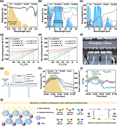 总之,他们成功开发了一种新型聚乙烯非织造布(PE-MSZ),通过将辐射制冷与光催化抗菌功能有机结合,实现了优异的综合性能。该多功能特性是通过在纤维表面原位逐层沉积SiO2和ZIF-8涂层构建的。所得PE-MSZ非织造布表现出高达90.8%的太阳光反射率、93.5%的强-中红外发射率以及99.9%的优异抗菌效率。同时,该材料展现出显著的辐射制冷能力,白天平均降温2.9°C,夜间降温幅度可达6.8°C。