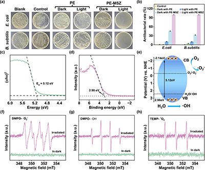 文章研究了PE-MSZ非织造布对大肠杆菌和枯草芽孢杆菌的光催化抗菌活性,经过120分钟模拟太阳光照射后,PE-MSZ非织造布完全抑制了大肠杆菌与枯草芽孢杆菌的生长,实现99.9%的抗菌率。