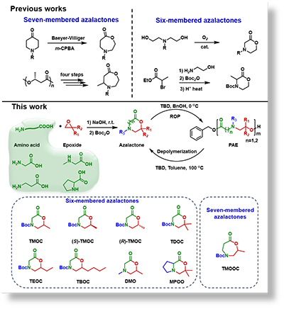 聚氨基酯是一类重要的生物可降解高分子材料,其重复单元含有氨基和酯键结构,兼具聚酯的生物可降解性和氨基丰富的功能可调性,在药物递送、基因工程等生物医学领域具有广泛应用前景。氮杂内酯开环聚合是制备聚氨基酯的重要方法。然而,现有氮杂内酯单体的合成主要依赖于哌啶酮的Baeyer?Villiger氧化反应或基于金属配合物催化的氨基乙醇氧化多步法,导致单体种类有限、结构修饰策略单一,目前主要局限于N-酰基取代基的变更。此外,这些单体的起始原料多源于石油基资源,与可持续发展目标相悖,从而制约了聚氨基酯结构的多样性及其应用拓展。因此,开发新型合成方法、建立丰富的氮杂内酯单体库,进而实现结构多样化的聚氨基酯的可控制备,是该领域的巨大挑战。