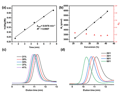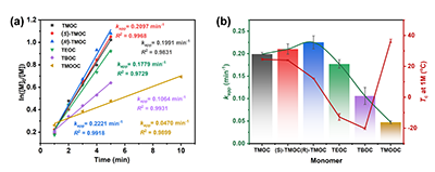 该团队开发了一种基于氨基酸平台制备聚氨基酯的高效合成新策略。该研究以氨基酸和环氧化物为起始原料,通过两步法合成了一系列结构各异的氮杂内酯单体(图1)。该方法具有廉价易得、结构丰富、原料可再生等优势,能够对氮杂内酯单体的N-取代基、环尺寸、内酯核取代基的位置与位阻以及立体构型进行定向修饰。TBD催化氮杂内酯开环聚合表现出活性/可控特征(图2)。聚合动力学研究表明,六元环氮杂内酯单体TMOC的表观聚合速率常数是七元环单体TMOOC4.2倍;随着内酯核取代基链长的降低,表观聚合速率常数逐渐增大(图3)。热力学研究表明,增大内酯核取代基长度C1-C4,能够降低Tc24~-20 oC,获得更高单体转化率;其中,七元环氮杂内酯单体(TMOOC)具有最高的Tc37 oC),表现出最高的单体转化率94%(图3)。解聚研究表明,合成的聚氨基酯都能够完全解聚为原始单体,且解聚速率常数与相应单体的聚合速率常数呈负相关(图4)。热性能分析表明,5种聚氨基酯为无定形高分子材料(Tg-3~39 oC),PTBOC为半结晶材料,熔点为144oC本研究成功构建了基于氨基酸的聚氨基酯合成平台,系统揭示了调控聚合与解聚过程的构效关系,为理性设计定制化聚氨基酯提供了重要理论依据与实践指导。