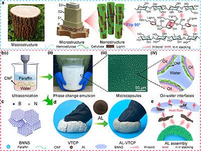 灵感源自木材的卓越力学性能,其根源在于木质素通过氢键等超分子作用力扮演“天然粘合剂”。我们模仿这一原理,以纤维素纳米纤维(CNF)稳定包裹石蜡,形成相变乳液,再引入氮化硼纳米片(BNNS)提升导热。关键创新在于加入了碱木质素(AL),它像分子“桥梁”一样,通过超分子作用力将各组分紧密“编织”在一起,从而显著改善了复合材料的粘弹性和结构完整性(图1)。