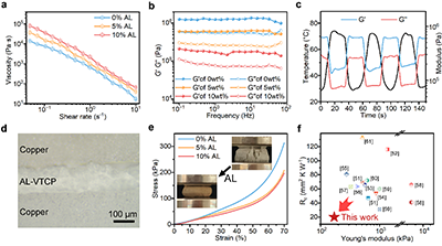 流变测试表明,添加木质素后,材料粘弹性显著提升,呈现出更优异的凝胶行为,且更容易变形。这种增强的柔韧性使其能紧密贴合粗糙表面,有效填充缝隙。对比数据显示,AL-VTCP拥有极低的压缩模量(170 kPa)和接触热阻(20.0 mm2 K W?1),远超多数报道的热界面材料,完美解决了高导热与软贴合之间的固有矛盾(图3)。