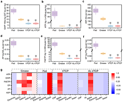 从原料到成品的生命周期评估表明,AL-VTCP及其前驱体VTCP在多项环境指标(如全球变暖潜力、人体毒性潜力等)上均显著低于传统以PDMS为基的商用导热产品,展现出优异的环保特性。这主要归功于其以生物质(木质素、纤维素)和水为基础的材料设计,为发展高性能且可持续的电子散热材料提供了新范式(图8)。