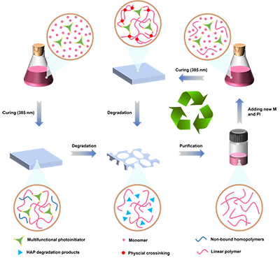 1 基于多功能光引发剂实现材料固化-降解循环的示意图
