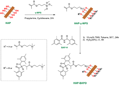 该多功能光引发剂的制备路线简洁高效(图2:首先通过碱催化水解缩合反应制备改性HAP,随后利用phospha-Michael加成反应引入光引发剂前驱体(BAP-H),最后经氧化得到HAP-BAPO。这一设计巧妙地将无机纳米粒子与有机光引发基团结合,实现了结构与功能的双重调控