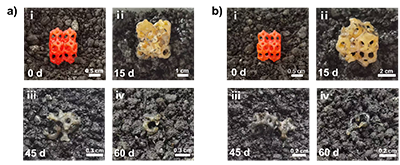 5 Kelvin晶胞结构的降解。a)不含线型聚合物的样品:(i)初始状态;埋入弱酸性土壤后分别于第15天(ii)、第45天(iii)和第60天(iv)拍摄的照片。b)含5%线型聚合物的样品:(i)初始状态;埋入弱酸性土壤后分别于第15天(i)、第45天(iii)和第60天(iv)拍摄的照片。注:土壤降解过程中,材料由红色逐渐变为淡黄色,归因于光吸收剂苏丹红I从聚合物基体中缓慢溶出。