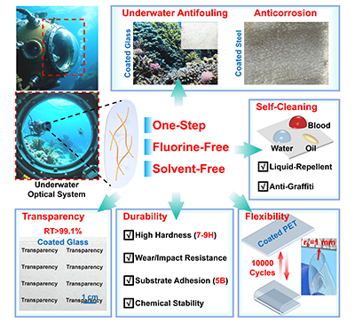 2025年12月12日,相关工作以One-Step Solvent-Free Dual-Curing Strategy for Fluorine-Free Omniphobic Coatings: Synchronizing High Transparency, Durability, and Antifouling in Underwater Optical Systems为题发表在《Advanced Functional Materials》上。