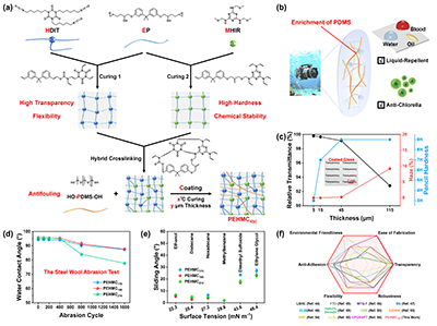 针对这一难题,近日,福州大学赖跃坤教授团队成功开发出一种基于一步法无溶剂双固化策略的无氟全疏透明涂层(PEHMC)。通过构建环氧树脂(EP)与双固化剂(HDIT/MHIR)及有机硅(HO-PDMS-OH)互穿的致密网络,同步实现了>99.1%的高透明度、7-9H铅笔硬度、10000次弯曲的极佳柔韧性,以及对低表面张力液体滑动角<4.1°的优异全疏性能,为水下光学系统提供了一种绿色、高效、耐久的保护方案。
