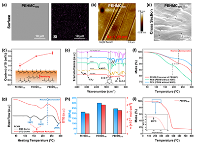 图2通过多种表征手段深入揭示了PEHMC涂层的微观结构与热力学特性。表面形貌分析显示,涂层表面极其平整光滑:扫描电子显微镜(SEM)图像未观察到明显粗糙特征,原子力显微镜(AFM)测得的表面粗糙度Ra仅为1.29 nm。能量色散X射线光谱(EDX)分析证实Si元素在涂层中均匀分布,且随着固化温度升高,表面的Si含量显著增加,表明HO-PDMS-OH在热作用下向表面富集。衰减全反射傅里叶变换红外光谱(ATR-FTIR)分析确认了所有反应基团的完全转化,特征峰表明形成了稳定的聚氨酯/聚醚交联网络。热分析结果(TG-DSC)显示,涂层体系具有优异的热稳定性,在温度达到200℃时开始发生缓慢分解。动态力学分析则表明,PEHMC190涂层具有相对最高的储能模量,交联密度计算值与硬度测试结果高度相关,揭示了微观结构与宏观性能之间的内在联系。