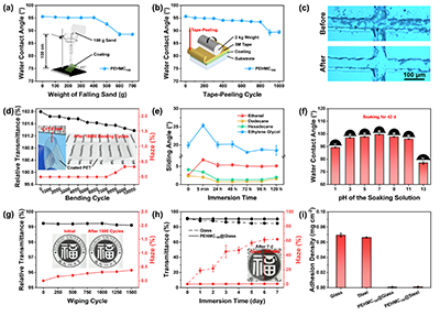 图4系统评估了PEHMC涂层在严苛环境下的长期耐久性能。力学耐久性测试表明,涂层经历700 g砂粒从1 m高度冲击后,水接触角仅轻微下降;经过1000次胶带剥离循环,涂层仍保持优异的附着力;划格法测试达到最高等级5B;在10000次弯曲循环(弯曲半径为1 mm)后,PET基底上涂层的雾度仅增加0.34%,透光率损失仅0.6%,展现出卓越的柔韧性。化学稳定性测试显示,涂层在极端pH环境(pH 1-13)中浸泡42 d后,疏水性能保持稳定;在多种有机溶剂中浸泡120 h,光学性能无明显变化。防污性能测试结果尤为突出:在模拟海水中浸泡7 d,涂层的透光率和雾度几乎不变;4 d蛋白质吸附测试显示,牛血清蛋白的吸附密度比未涂层基底降低超过90%;对人工血液、酱油、甘油等多种复杂液体均表现出良好的排斥性,滑动角均低于18°。这些结果表明,涂层通过致密交联网络和表面富集的有机硅链段,构建了热力学和动力学双重防污机制。