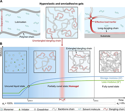 实现该性能的关键在于高分子网络中富含长悬挂链和充足的良溶剂。然而,为给定聚合物网络匹配良溶剂常因化学结构差异而困难,且相容性深刻影响凝胶力学性能。本文采用简便的一步法合成策略,通过控制聚合动力学,制备出含长悬挂链且溶剂与高分子网络具有相同化学性质的凝胶(图1B),称为“均质凝胶”。在单体溶液中,未固化时储能模量(G'''')低于损耗模量(G")。固化过程中,单体反应形成高分子链,进而交联成网络。G''''与G"随时间增长,在凝胶点相交,标志初始网络形成;最终在完全固化时达到平台,转化为高缠结的粘弹性弹性体或塑料。中间状态为部分固化,部分单体形成网络,剩余部分作为溶剂保留。其中存在一个时间区间tHO,其间悬挂链较长却无缠结,此时凝胶同时具备高弹性与强粘接。若固化程度低于tHO,凝胶交联稀疏,力学性能弱;高于tHO,则出现悬挂链缠结,凝胶呈现粘弹性。