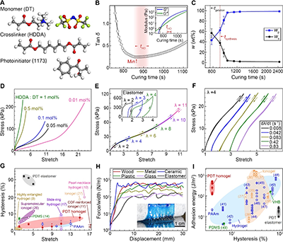 本文以具有链间静电相互作用的离子凝胶体系为例进行具体说明。合成采用以离子液体单体DT(2-(丙烯酰氧基)-N,N,N-三甲基乙铵双(三氟甲基磺酰基)酰亚胺,粘度0.19±0.02 Pa·s),共价交联剂HDDA及光引发剂1173组成的前驱体体系(图2A)。通过监测不同交联剂含量下的固化流变曲线,确定凝胶点在~764 s,并在~866 s处观察到损耗因子达到极小值(图2B)。高弹性与强粘接的均质凝胶的合成窗口(tHO)位于该极小值附近(约860–920 s),其合理性经后续的滞后与粘附测试验证。该均质凝胶的溶剂含量受交联剂用量影响较小,但随固化时间延长而降低,相应的聚合物含量则随之上升,并在~1260 s后达到平衡(图2C)。本工作中,高性能PDT均质凝胶的合成时间设定为900 s,此时溶剂含量为38 wt%。