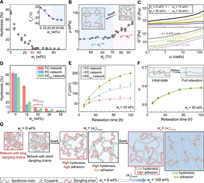 强粘接性能源于凝胶表面存在的长悬挂链。这些长悬挂链从网络中充分解缠后,可吸附于各类基底,形成强相互作用从而产生强粘接。本文将三种聚合物网络溶胀至溶剂含量为 30 wt%,经不同时间弛豫后测量其与亚克力板之间的粘接能。所有体系的粘附能均随弛豫时间延长而增加(图3E),其中PCHO网络因具有最长的悬挂链而表现出最高的粘接能。从微观层面,本文采用Curro?Pincus方法研究了PCHO网络在不同弛豫时间下损耗模量随频率的变化。指数α随弛豫时间增加而增大,表明悬挂链逐渐解缠结(图 3F)。解缠结的长悬挂链是实现强粘附的关键。所以,当良溶剂含量超过临界值时,具有长悬挂链的网络可同时实现低迟滞与高粘接(图3G)。