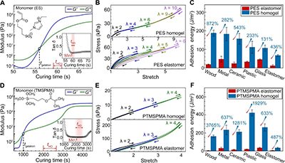 高弹性和强粘接凝胶的合成原理具有通用性。本文进一步通过聚阴离子与中性聚合物体系加以验证。对于聚阴离子体系,选用单体为1-乙基-3-甲基咪唑(3-磺丙基)丙烯酸酯(ES),凝胶点在~56 s,tHO在59至61 s之间(图4A)。高弹性和强粘接的PES均质凝胶的合成时间设定为~60 s,此时溶剂含量约40 wt%。PES均质凝胶表现出可忽略的迟滞,而相应的PES弹性体则呈现明显迟滞(图4B)。与PES弹性体相比,PES均质凝胶在各基底上的粘接能均显著提升(图4C)。对于中性聚合物体系,选用单体为甲基丙烯酸3-(三甲氧基硅基)丙酯(TMSPMA),凝胶点在~977秒,tHO在2000至2645 s之间(图4D)。高弹性和强粘接的PTMSPMA均质凝胶的合成时间为~2400 s,溶剂含量约28 wt%。同样,与对应弹性体相比,PTMSPMA均质凝胶表现出更低的滞后性和更高的粘接性能(图4E、4F)。所以,通过在聚阴离子与中性聚合物体系中成功复现高弹性和强粘接性能,进一步证实了该设计原理的普适性。