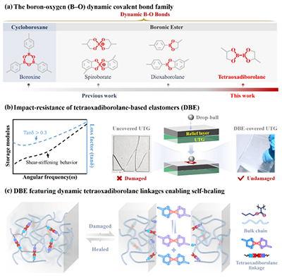 抗冲击材料在缓冲防护领域(如运动装备、精密仪器减震、航空航天结构)发挥着关键作用。然而,传统弹性体材料普遍存在损耗因子低、抗冲击性能不足的问题,难以满足极端工况下的能量耗散需求。近年来,动态键交联聚合物网络因其可逆键交换特性,成为提升材料抗冲击性和自修复能力的有效策略。其中,硼酯键因其可逆断裂/重组能力、路易斯酸性可调及丰富的配位模式,在动态共价化学和功能材料领域备受关注。然而,传统硼酯键(如螺硼酸酯、硼酯及硼氧六环结构)的交换反应通常需要外部刺激驱动。如何在常温实现硼酯键网络的自发快速动态重排,从而协同优化材料的抗冲击性能与自修复效率,是当前研究的挑战。
