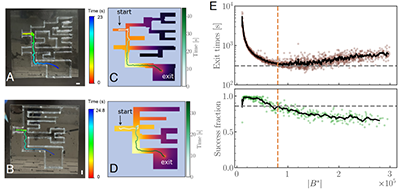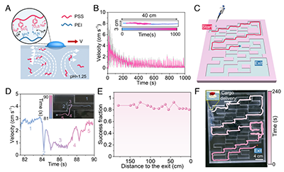 为了验证这一机制,研究团队使用由聚乙烯亚胺(PEI)和聚苯乙烯磺酸钠(PSS)络合而成的毫米级液滴进行实验。这是一种通过自生聚电解质浓度梯度驱动的水-水液滴马达。它在自固化时释放可降低表面张力的聚电解质PSS,从而降低周围水的表面张力,进而诱导液滴自主推进。当这些液滴被放置在充满水的迷宫中时,它们自发地开始运动,令人惊讶的是,它们无需任何外部指引,便能顺利地导航到出口。高速录像显示,液滴在接近交叉口时会减速,感知来自死胡同的化学回声,并及时转向避开。通过重复实验,大多数液滴成功地解决了迷宫问题,且随着迷宫长度的增加,液滴的导航时间逐渐增加,到达出口的成功率可保持在80%以上。模拟结果与实验结果显示一致,液滴在每个交叉口都能做出正确选择,并有效地到达出口。更重要的是,该结果对复杂迷宫具有鲁棒性。与此相比,传统的依赖于化学源进行迷宫探索的方法迷宫尺寸增大时变得不可靠,因为随着距离的增大,引导信号会减弱。