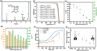 首先,使用膦磺酸钯催化剂,通过聚合条件的控制,获得了具有不同CBE插入比和分子量的共聚物,并对共聚物热稳定性、机械性能与表面性质进行了详细的分析,证明了共聚物性质的高度可调性,尤其是低CBE含量的共聚物性质非常接近商业聚乙烯。