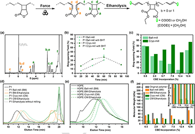接着,从球磨温度、时间以及频率等方面详细研究了以上共聚物的机械降解。在球磨时加入少量阻聚剂可以有效减少交联副反应的发生,进而提高四元环的开环效率。从实验结果看,低温球磨(CM)普遍能够获得优于室温球磨(BM)的开环效率。但当CBE的含量极低时,BM能够获得与CM相当的开环效率。其主要原因在于,处于无定形区的含CBE单元的链段被锚定在聚乙烯链段形成的晶区之间,达到了类似于链段低温冻结的效果。