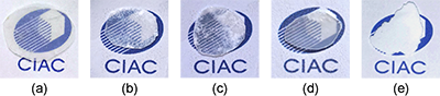 图3 样品冷压图片. (a) P1; (b) P2; (c) P3; (d) P6; (e) Commercial UHMWPE.