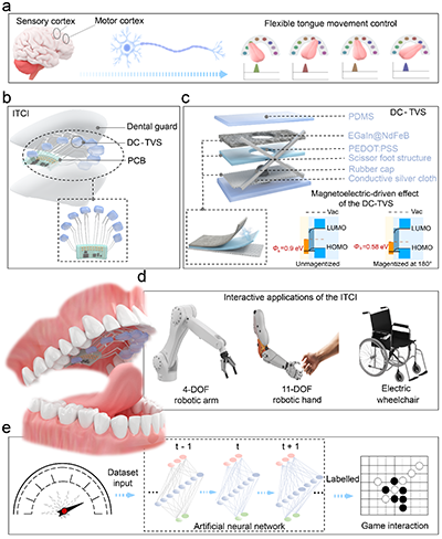为了拓展现有交互式人机界面(HCI)技术的局性,特别是环境敏感性和用户疲劳问题,近日中国科学院北京纳米能源所李琳琳研究员团队与王中林院士、蒲雄研究员团队合作,开发了一种集成式交互式舌-机交互界面(ITCI),该器件一体化集成到3D打印的牙科护具上,用于触觉感知和人机交互,兼具非侵入性、自供能和环境兼容性等优势。磁电效应增强的直流摩擦伏特传感器件阵列,能够在舌触发下高效地将机械刺激转化为高灵敏度和高可靠性的电信号。在机器学习的辅助下,该系统能够与多种平台进行交互,包括操控机械臂、轮椅和虚拟游戏,在辅助式人机协作、医疗康复、智能家居控制和极端环境中的通信方面具有广阔的应用前景。