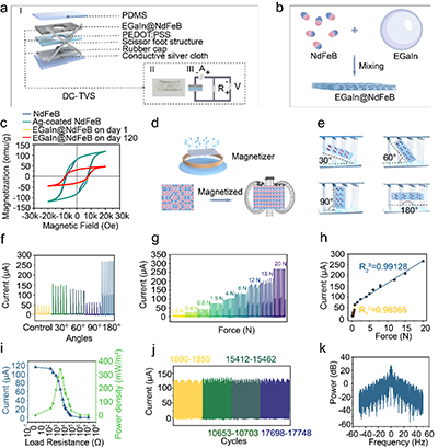 阵列中每个独立传感器都是灵活的、自供电的直流摩擦伏特传感器(DC-TVSs),该传感器基于掺杂PEG的p型聚(3,4-乙撑二氧噻吩):聚(苯乙烯磺酸)(PEDOT:PSS)半导体薄膜与复合了钕铁硼永磁颗粒的镓铟液态金属薄膜(EGaIn@NdFeB)之间的接触-分离实现力电信号的转换。为了提高机械稳定性和长期可靠性,他们引入了剪刀脚机械结构,以取代传统的拱形结构,该结构促进了自回弹的接触-分离动力学,有效地减少了材料疲劳,并在长期使用中显著提高了耐用性(图2)。