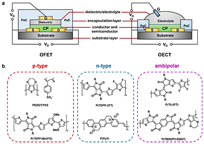 图2 作为半导体的共轭聚合物及其在晶体管中的应用。a) OFET和OECT器件结构示意图。b) p型、n型及双极性共轭聚合物半导体的代表性分子结构。