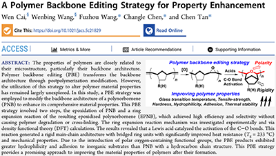 近日,中国科学技术大学陈昶乐教授、安徽大学王福周研究员、安徽大学谭忱研究员等人利用聚合物主链编辑(PBE)策略,通过对降冰片烯聚合物(PNB)进行环氧化以及主链扩环重构,实现了向COPs主链中直接引入刚性桥环结构与极性含氧官能团,得到高性能COPs。该策略无需使用结构复杂的共聚单体,即可实现COPs的耐热性、力学性能、亲水性及与无机基底粘附性的多方面提升,为高性能COPs的制备提供了新路线。2026年2月27日,相关研究成果以A Polymer Backbone Editing Strategy for Property Enhancement为题发表于《Journal of the American Chemical Society》(JACS)。
