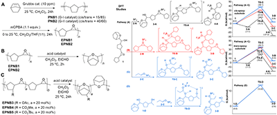 作者们首先通过环烯烃易位聚合制备降冰片烯聚合物,再经环氧化反应得到环氧化降冰片烯聚合物(EPNB),随后在路易斯酸 BF?-Et?O 催化下实现环氧基团的分子内环扩环反应,从而实现主链扩环重构。该策略实现了主链的高效、高选择性转化。反应体系中丙醛添加剂可有效封端聚合物主链残留羟基,抑制分子间交联与羟基消除导致的聚合物黄变,保障了产物的光学性能与加工性能。为揭示反应机理,作者们结合实验表征与密度泛函理论(DFT)计算证实,该环扩环反应为分子内级联反应,其能垒远低于分子间反应,因此可避免交联固化问题,生成线性聚合物。不同催化剂的空间位阻与电子效应会影响主链编辑的立体选择性,进而调控产物的玻璃化转变温度(Tg)等关键性能。