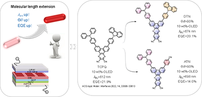 在这篇文章中作者以三苯胺为给体、二苯并[a,c]吩嗪-11,12-二甲腈为受体,通过不对称连接方式引入另外一个官能团,既增强了分子刚性,又有效调控了给受体间的电荷转移强度。这种设计旨在调控分子发光的同时提升发光效率CBP主体材料中通过调控DTNATN的掺杂浓度(1100 wt.%),发射波长可分别覆盖602770 nm610790 nm,实现了从红光到深红光在到近红外区域的连续可调。其中,10 wt.%掺杂的DTN-OLED674 nm处实现了20.1%的最大外量子效率(EQE),创下基于二氰基吡嗪衍生物的深红光TADF-OLED的新纪录。即使在非掺杂器件中,DTN770 nm发射波长下仍保持2.9%EQE,处于当前非掺杂近红外TADF-OLED的领先水平。该研究为开发高效近红外TADF材料提供了新的设计范式。