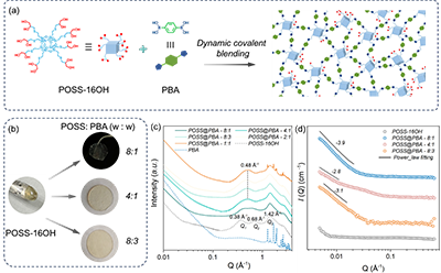 具体地,这种新型有机玻璃的构建思路清晰而精巧:以携带8个邻二羟基的POSS分子簇为结构单元,以1,4-苯二硼酸为交联剂,通过二者之间形成的动态硼酸酯键,将离散的“纳米积木”连接成三维网络。研究者通过核磁共振与红外光谱证实了动态共价键的成功构建,而小角X射线与中子散射技术则进一步揭示其微观结构:交联后的POSS核心保持完整,并在网络中均匀分散,原有的POSS聚集体被解构,为后续优异的宏观力学性能奠定了结构基础。研究同时发现,当PBA含量过高时,部分未反应的PBA会结晶析出,这一发现也为优化材料配比提供了明确指导。