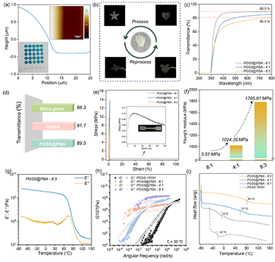 POSS@PBA粉末可在温和条件(60 °C)下被加工成任意形状,甚至制备成厚度仅1.3微米的超薄薄膜,展现出优异的加工适应性。光学测试表明,其透光率超过89.5%,与石英玻璃和PMMA相当,透明度随PBA含量增加略有下降,过高时因相分离和微晶形成导致不透明。力学性能随PBA含量呈现大范围调控:低含量时材料柔软可拉伸(模量3.51 MPa),高含量时转变为刚性玻璃(模量1.79 GPa,提升近500倍),剪切模量在宽温区内保持GPa水平。通过重熔-再固化循环,材料可完全恢复原始性能,实现闭环回收。这一结果清晰地揭示了交联密度对材料性能的决定性影响。