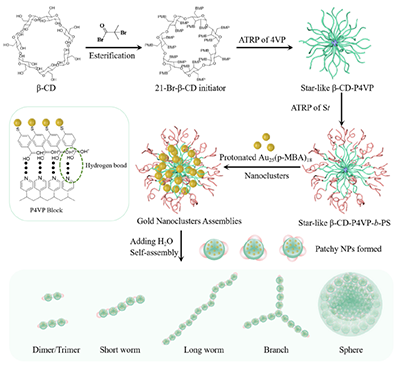 该研究通过原子转移自由基聚合(ATRP)精心设计合成出一种星型两嵌段共聚物——以β-环糊精为核心、聚(4-乙烯基吡啶)-b-聚苯乙烯(β-CD-g-P4VP-b-PS)为臂的单分子胶束。这种结构既能作为“纳米反应器”,封装预先合成的原子级精确[Au??(p-MBA)??]?团簇,又能通过氢键作用将其牢固固定在P4VP内核中,形成均一的二级结构组装体。通过ATRP聚合可控合成不同尺寸单分子胶束,从而制备出不同尺寸的金纳米团簇组装体。这些组装体呈近乎单分散的球形,并在外层包裹一层疏水性的PS链段。当加入不良溶剂水后,PS链因溶解性下降而发生局部塌缩,在纳米球表面形成若干个“疏水补丁”(patchy nanoparticles),从而赋予其类似化学官能团的“反应活性”。