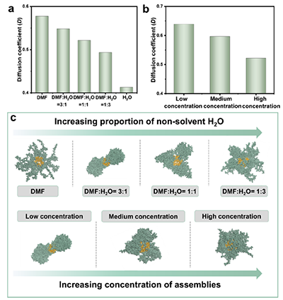 对补丁形成进行分子动力学模拟。随着不良溶剂(水)含量的增加,PS链的溶解性变差,导致其扩散系数降低。模拟结果表明在纯DMF中不形成补丁;随着水量增加,补丁数量逐渐增多,最多可达5个。这与实验观察完全一致。系统浓度越高,形成的补丁数量越多。低浓度时形成2个补丁,中等浓度时形成3个,高浓度时则形成多个补丁。补丁的形成源于PS链段在不良溶剂环境下的疏水聚集。更高的水含量或更高的粒子浓度会增强链段间的吸引力,促进局部高密度区域的形成,从而产生更多补丁。相反,当吸引力减弱时,链段趋于分散,补丁结构便会消失。