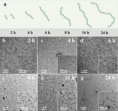 最引人注目的发现是,这些带有补丁的纳米粒子可在溶液中进一步“聚合”,形成类似高分子长链的超结构。这一过程被称为“胶体聚合”,其动力学特征与传统的逐步增长聚合高度相似。通过透射电镜追踪不同时间下的组装进程,发现随着组装时间延长,线性链中的纳米单元数目持续增加。通过对平均聚合度与时间的关系拟合,显示出极高的反应效率。